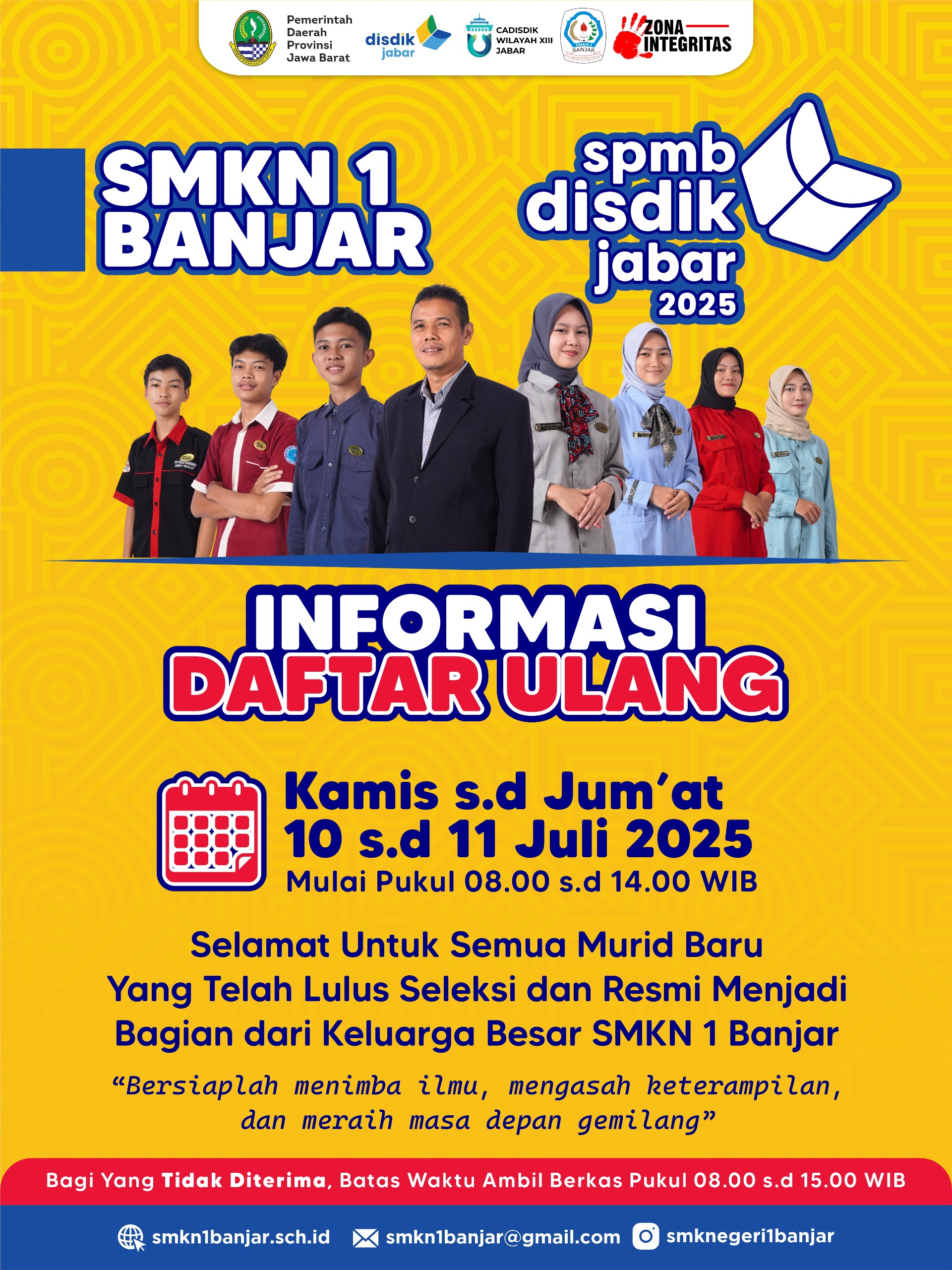 Daftar Ulang Siswa Baru SMKN 1 Banjar Tahun Pelajaran 2025/2026: Siap Menyambut Masa Depan Gemilang SMKN 1 Banjar dengan bangga menyambut para peserta didik baru yang telah lulus seleksi SPMB 2025 dan resmi menjadi bagian dari keluarga besar sekolah ini. Setelah melalui proses panjang dan penuh perjuangan, kini saatnya menapaki langkah baru melalui proses daftar ulang yang akan dilaksanakan pada: 📅 Hari & Tanggal: Kamis s.d Jumat, 10 – 11 [Baca Selanjutnya]